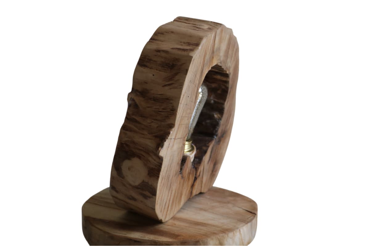 - Pièce unique : chaque lampe est façonnée selon la forme naturelle du bois, il n’en existe pas deux identiques