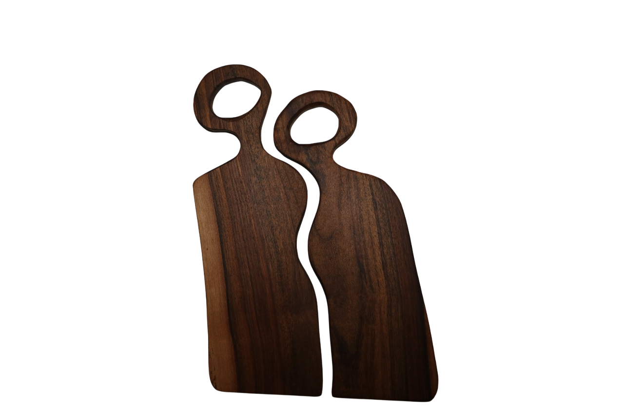 Apportez une touche artistique et chaleureuse à votre cuisine avec cette planche à découper en bois inspirée de l’harmonie du couple. Sculptée à la main dans notre atelier en Isère, cette pièce unique représente un homme et une femme, dont les silhouettes s'emboîtent naturellement, comme si elle reposait sa tête sur son épaule.